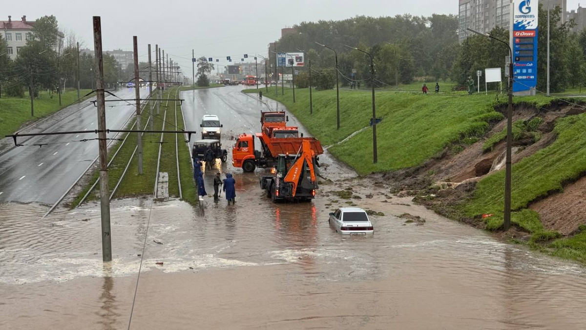 «В связи с нерасчетным количеством осадков ливневая канализация не справляется, в результате чего оказались подтоплены низменные участки, дворы, проезжие части (6 участков дорог) в Череповце», - сообщает региональный МЧС.